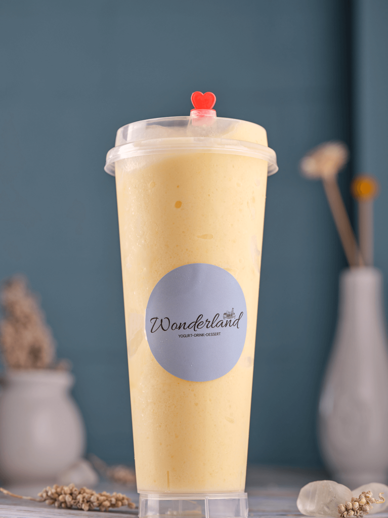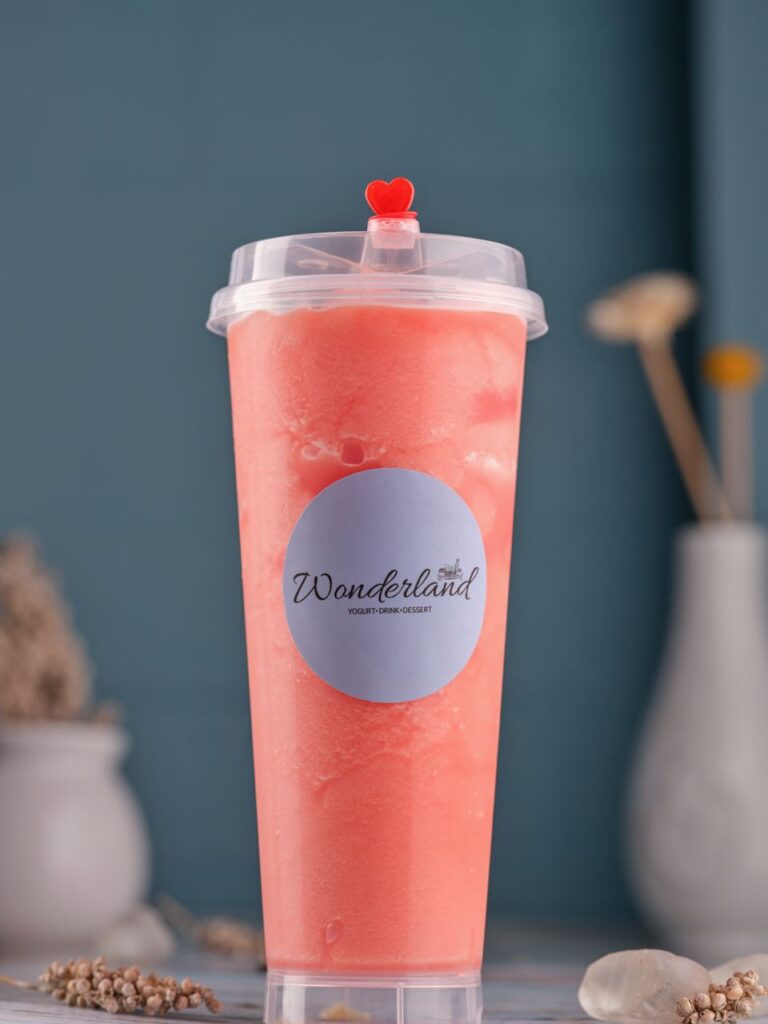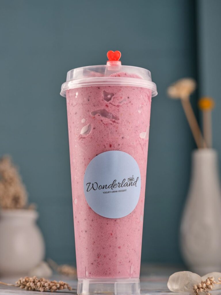 Fresh milk, blueberry syrup, strawberry, blueberry, ice